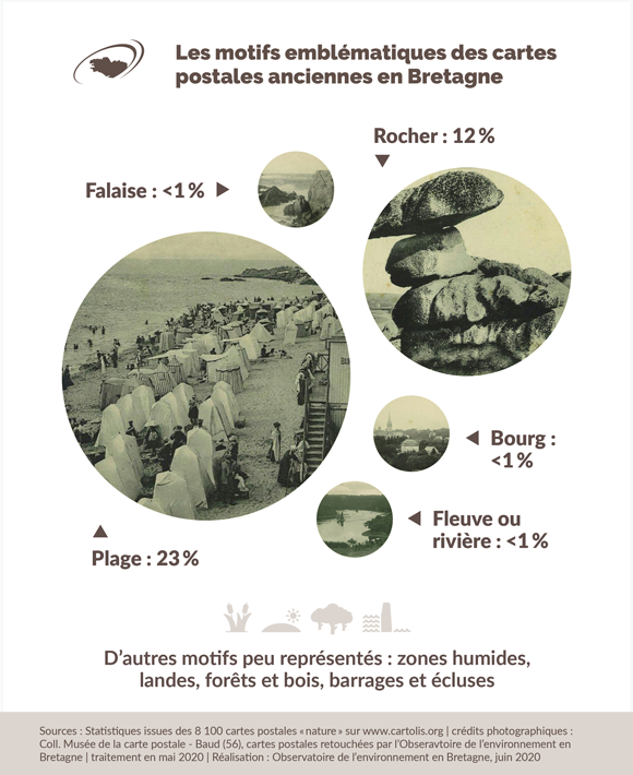 Les paysages bretons sont largement photographiés dans les cartes postales. Un motif paysager est alors mis en scène : il s’agit d’un élément emblématique du territoire qui lui confère son identité (phare, pont, arbre, etc.). La plage est un motif récurrent apparaissant sur 23 % des cartes postales, symbolisant les paysages balnéaires. Vient ensuite le motif du rocher, apparaissant sur 12 % des cartes postales et illustrant une Bretagne plus naturelle et sauvage, réminiscence du romantisme. L’identité paysagère de la Bretagne réside aussi bien dans le paysage balnéaire que dans le paysage naturel.