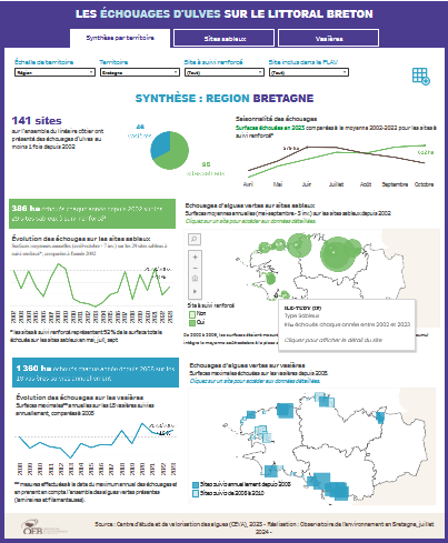 Depuis le début du suivi des marées vertes en 2002 sur le littoral breton, 141 sites ont été touchés au moins une fois. Ce sont pour deux-tiers des sites sableux (baies et plages sableuses) et pour un-tiers des vasières.