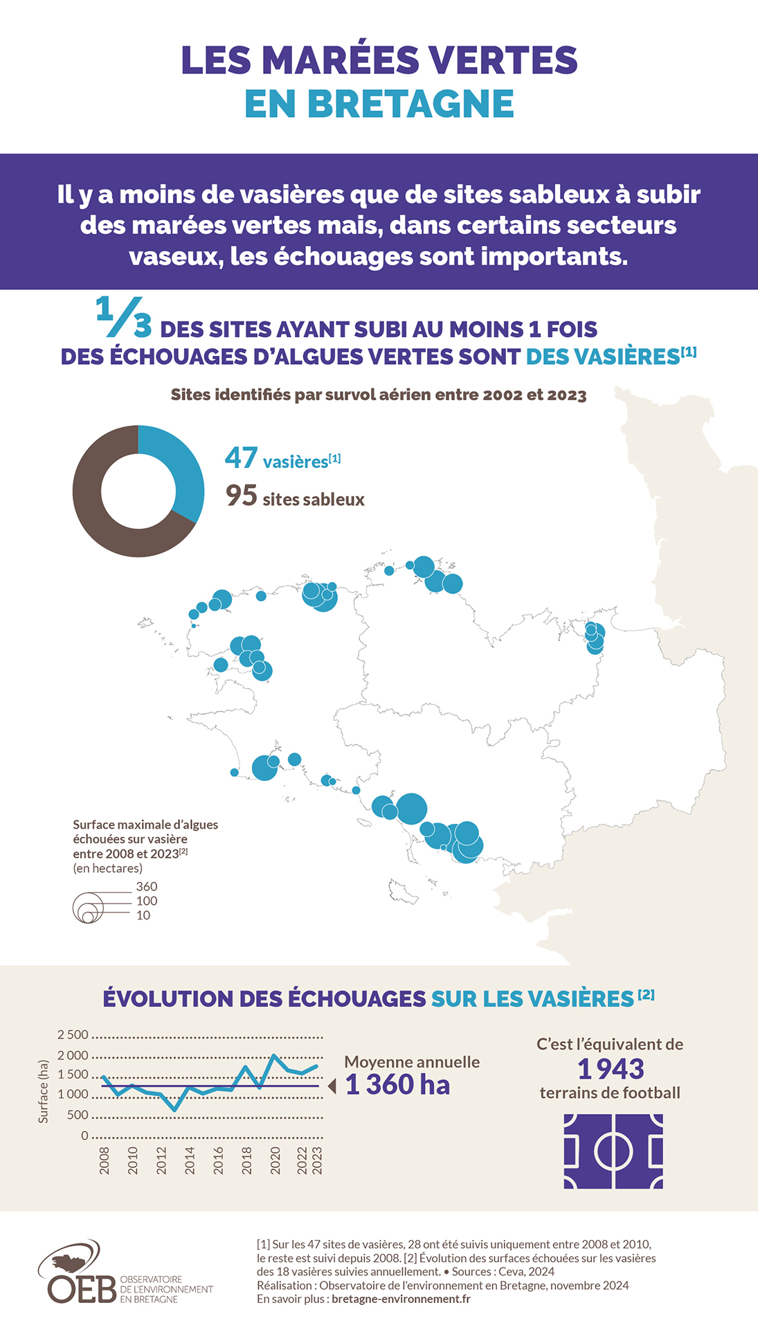 Il y a moins de vasières que de sites sableux à subir des marées vertes mais, dans certains secteurs vaseux, les échouages sont importants.