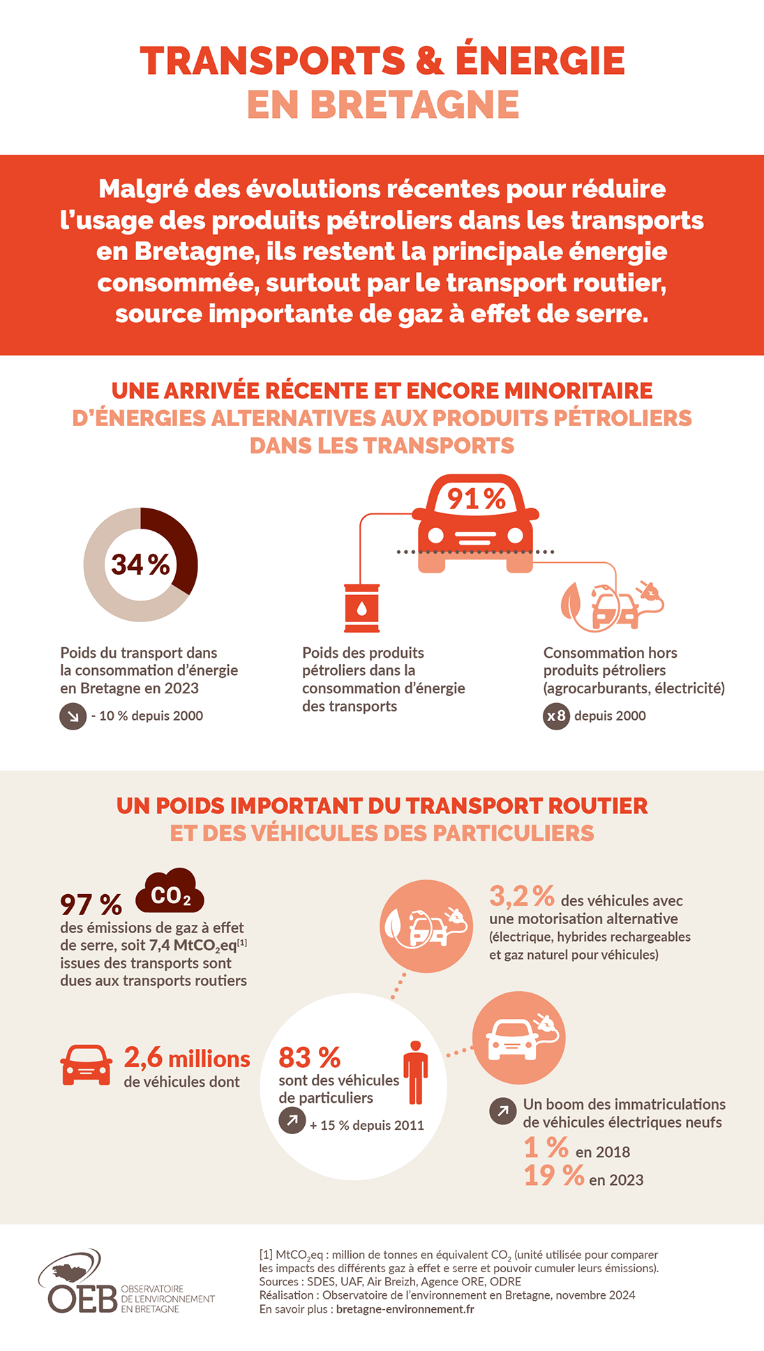 Malgré des évolutions récentes pour réduire l'usage des produits pétroliers dans les transports en Bretagne, ils restent la principale énergie consommée, surtout par le transport routier, source importante de gaz à effet de serre.