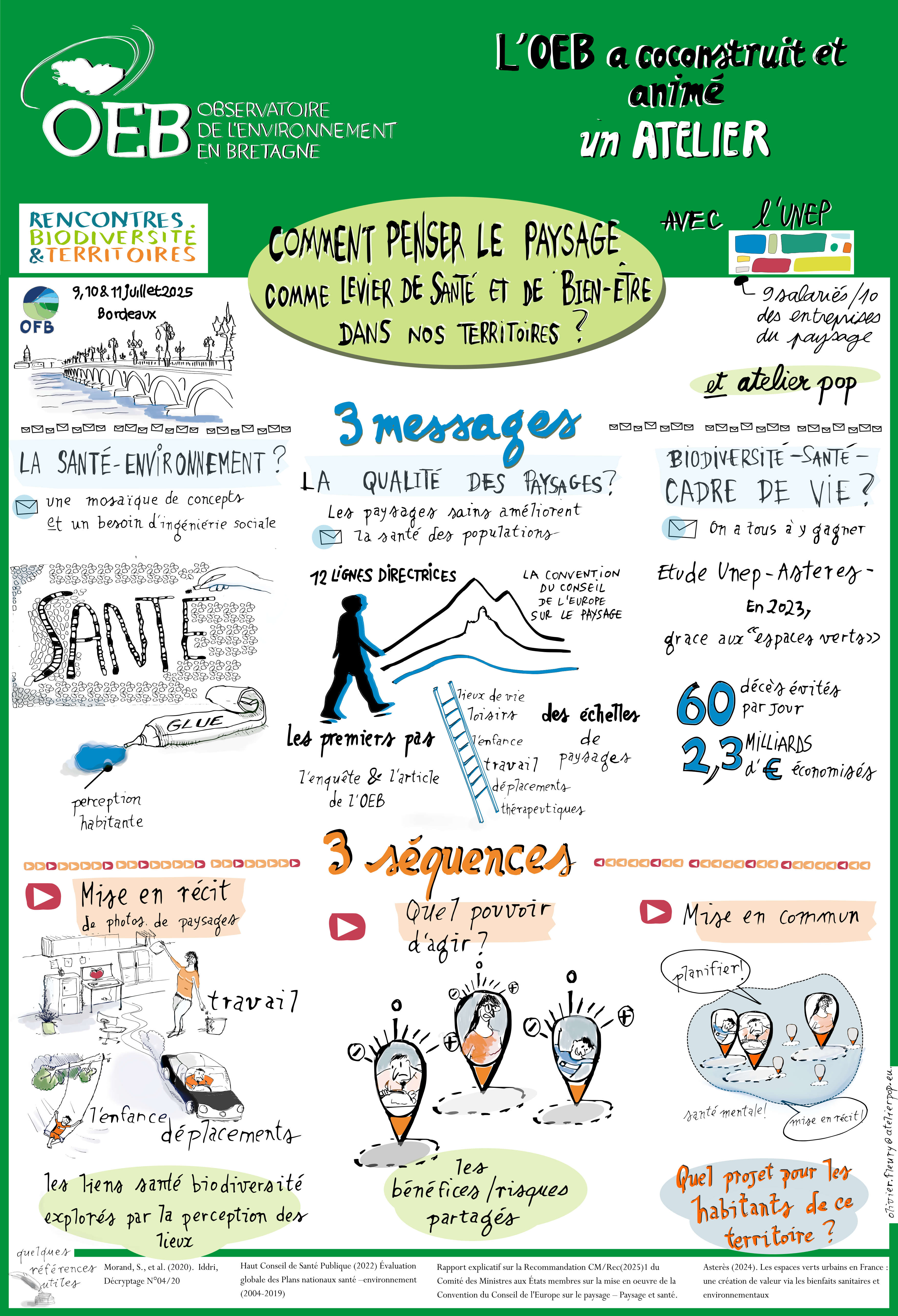 Lors des Rencontres "Biodiversité et territoires" organisées par l'Office Français de la Biodiversité (9, 10, 11 juillet 2025, Bordeaux), l'OEB, l'atelier POP (Olivier Fleury) et l'Union nationale des entreprises du paysage (Quentin Mettray) ont organisé un atelier questionnant les liens entre santé et paysages. Une quarantaine de participant·e·s a été invitée à :