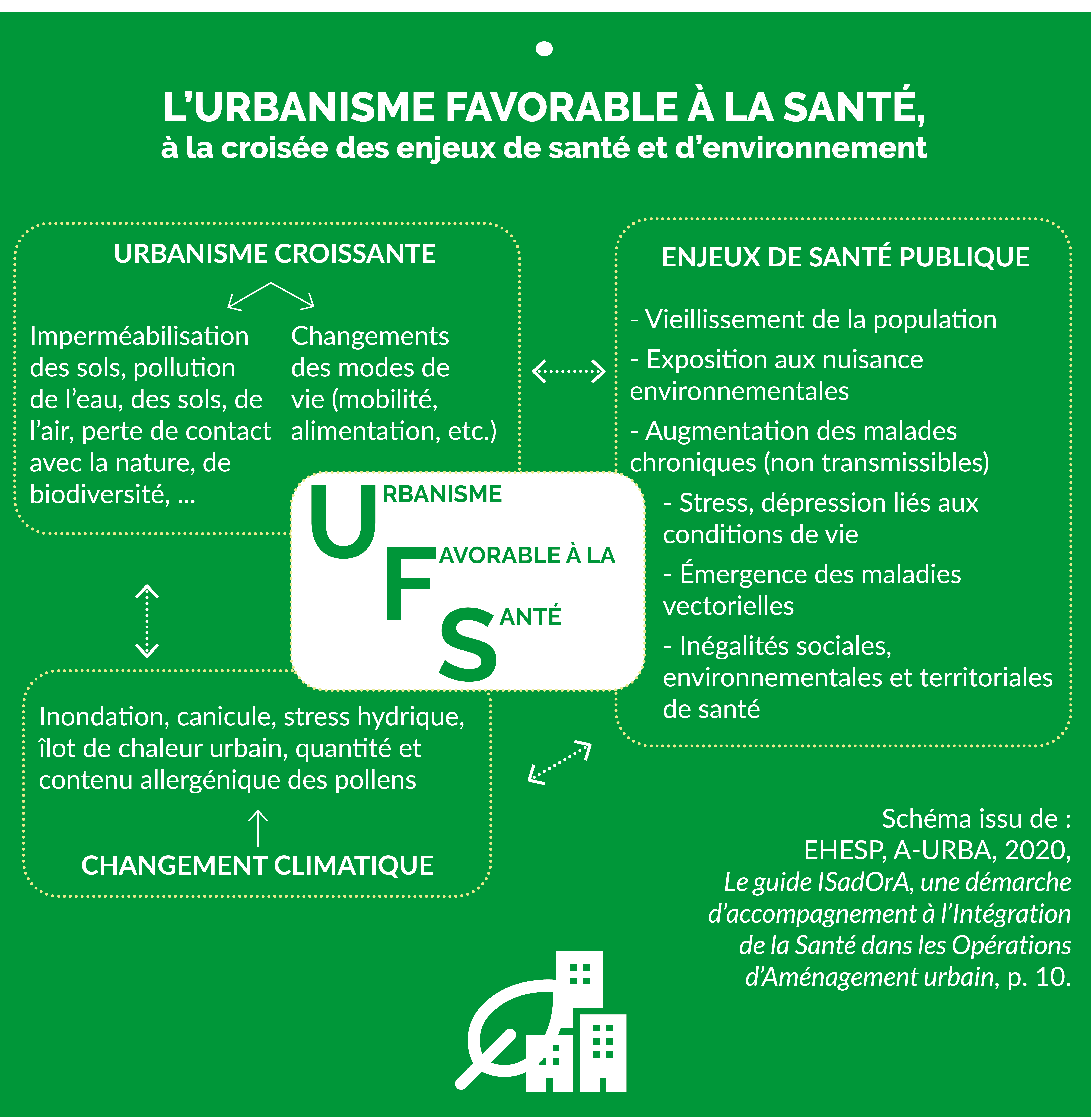 L’urbanisme favorable à la santé (UFS) développé, entre autres, par l’École des hautes études en santé publique (EHESP), apporte des méthodes pour concevoir des projets de territoire centrés sur la qualité de vie, le bien-être, l’environnement et le climat. « Il s’agit d’encourager des choix qui minimisent l’exposition de populations à des facteurs de risque (pollution de l’air, nuisances sonores, isolement sociale, etc.) et maximiser leur exposition à des facteurs de protection (activité physique, accès aux espaces verts, etc.) » [20].